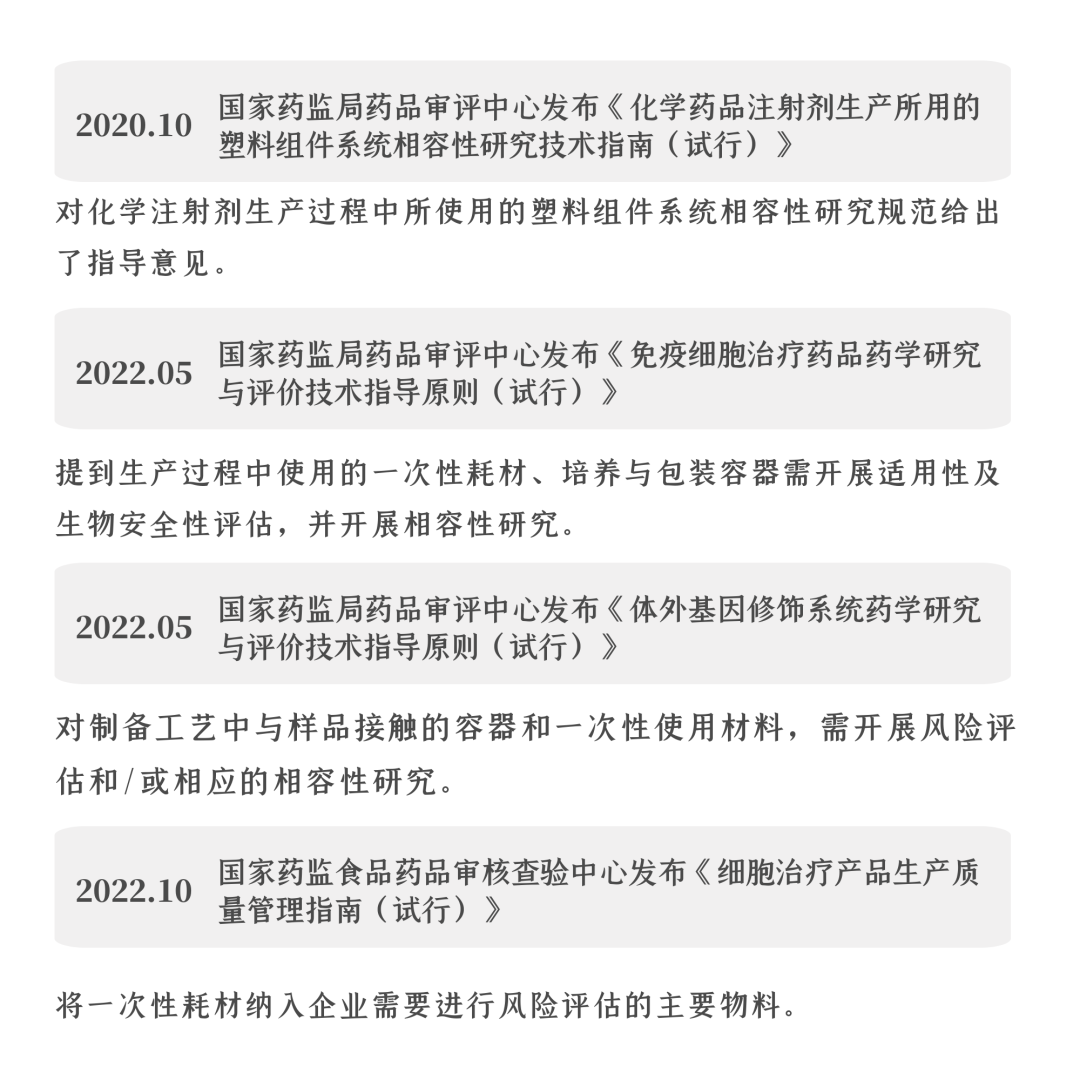 伴隨著生物醫(yī)藥行業(yè)的蓬勃發(fā)展,抗體、疫苗、重組蛋白、細胞治療、基因治療等生物醫(yī)藥需求增大,對生物制品相關的耗材產(chǎn)品也催生出更高要求。國家多項法規(guī)對生物實驗室耗材提出了明確的方向性意見,包括適用性研究、生物安全性研究、生物相容性研究等。