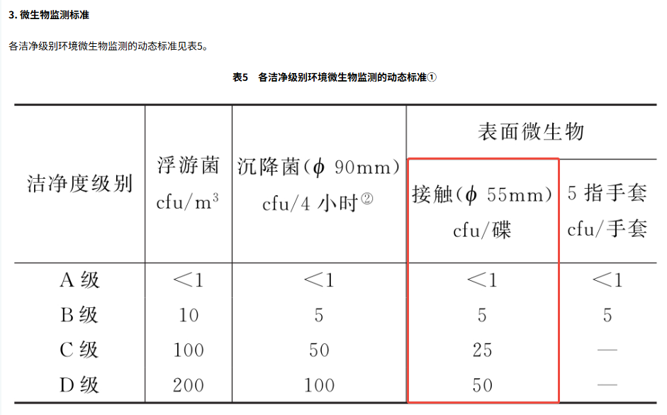 在食品、藥品生產(chǎn)過程以及GMP標(biāo)準(zhǔn)實驗室中,環(huán)境的潔凈度監(jiān)控至關(guān)重要,而環(huán)境中的表面微生物水平是評估環(huán)境潔凈度等級的重要指標(biāo),《中國藥典》(2020)微生物監(jiān)測指導(dǎo)原則中指出,接觸碟法是對規(guī)則表面或平面微生物監(jiān)測的常用方法,每碟取樣面積約為25cm²(Φ55mm),微生物計數(shù)結(jié)果以cfu/碟報告,根據(jù)其檢測結(jié)果可評估環(huán)境潔凈度等級。