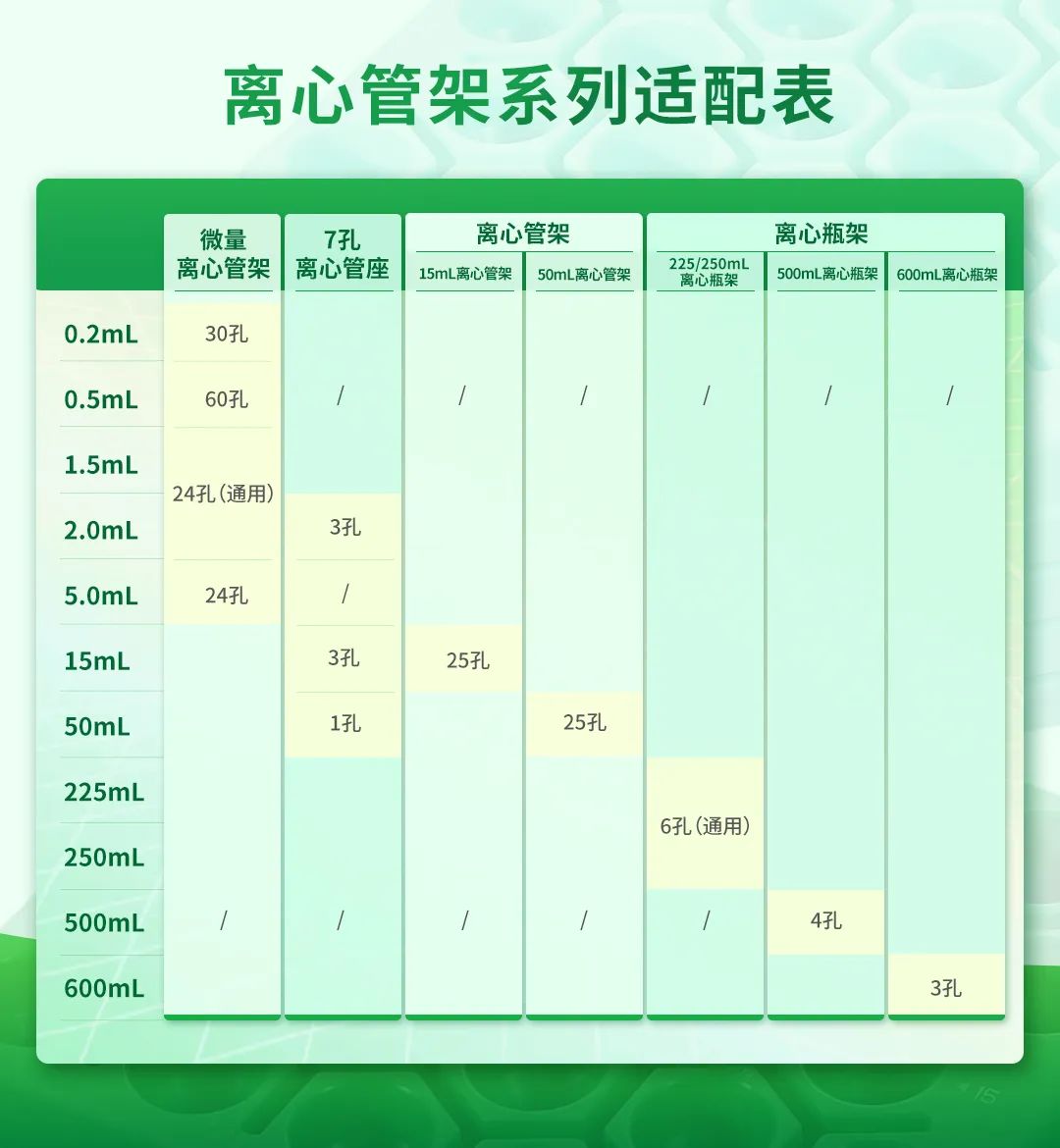 ◆ 3種規(guī)格可選,可滿足225、250、500、600mL離心瓶放置需求