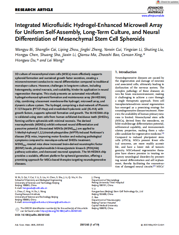2025年1月,北京科技大學(xué)杜宏武教授團(tuán)隊(duì)使用潔特生物胎牛血清在《Advanced Functional Materials》雜志刊登高質(zhì)論文《Integrated Microfluidic Hydrogel-Enhanced Microwell Arrayfor Uniform Self-Assembly, Long-Term Culture, and NeuralDifferentiation of Mesenchymal Stem Cell Spheroids》。